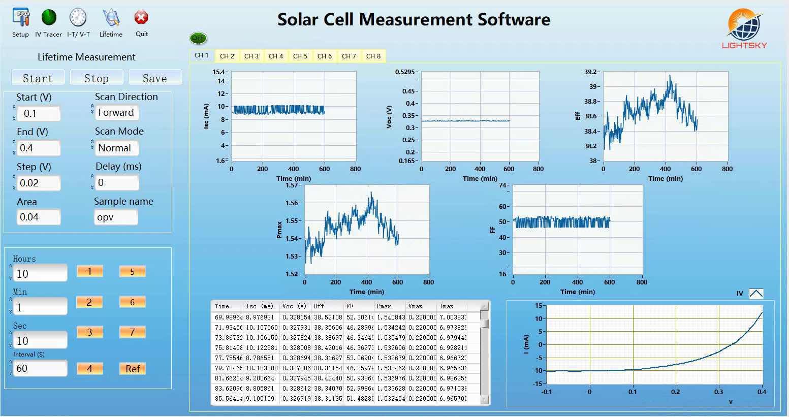 Provide the measurement parameter such as IV curve, Isc, Voc, FF, PCE and MPPT. Moreover, with Auto Save function, users do not need to worry losing the measurement data -